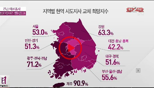 지역별 교체 희망지수는 제주가 90.9%로 가장 높았다. 이어 호남이 71.2%, 강원은 63.3% 순이었다.