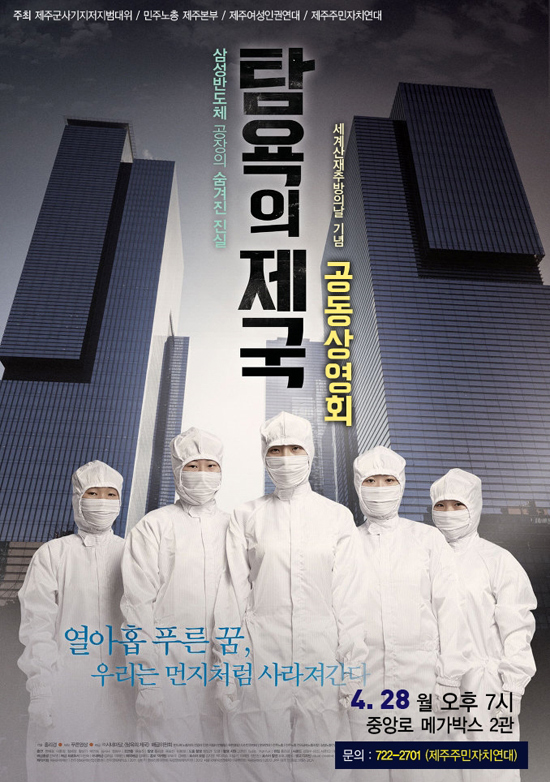 세계 산재추방의 날을 맞아 삼성 반도체 피해 노동자들의 삶을 다룬 '탐욕의 제국' 무료상영회가 제주에서 마련된다.