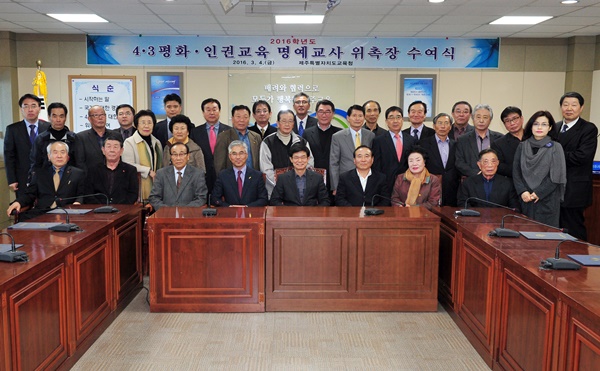 제주도교육청은 4일 오전 도교육청 2층 제1상황실에서 '2016학년도 4·3 평화·인권교육 명예교사' 27명에 위촉장을 전달했다.