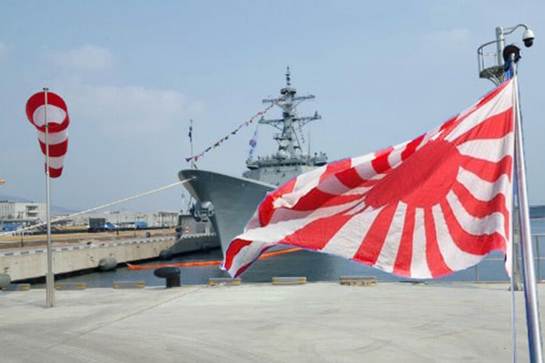문제는 일본 해상자위대 함정의 ‘욱일기’다. 욱일기는 해상자위대가 군기(軍旗)로 사용하고 있지만 제2차 세계대전 당시 사용했던 군기여서 일본제국주의의 상징이다. 1945년 일본이 패전 후 사용이 금지됐지만 1954년 해상자위대가 창설되면서 다시 등장했다.