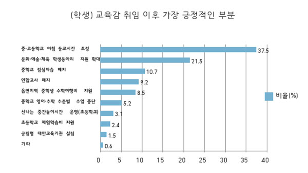 또 임기 후반기에 중점적으로 추진해야 할 정책으로 21.0%가 동아리 활동 활성화, 15.8%가 학생 인권존중, 13.6%가 폭력 없는 행복한 학교, 13.0%가 다양한 수업방식 적용, 12.3%가 학생들의 몸·마음 건강으로 답했다.