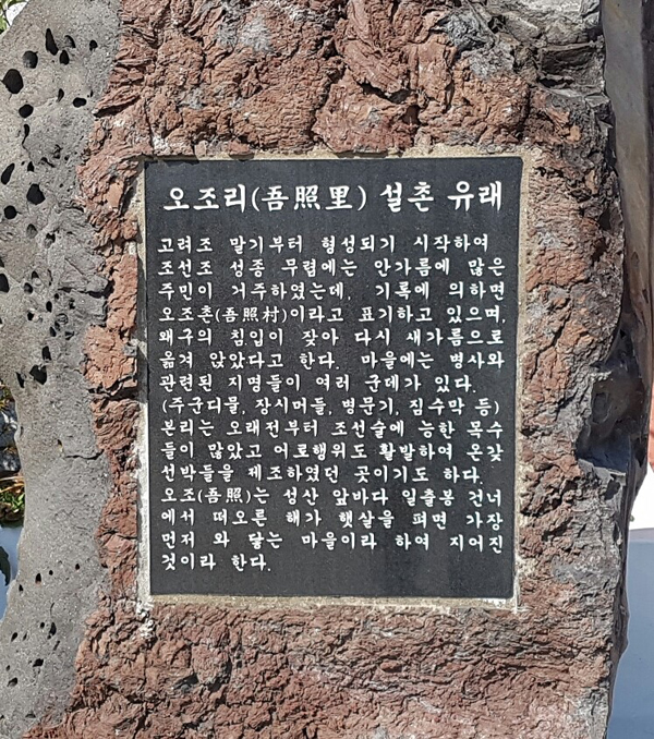 성산일출봉에서 솟은 해는 제일 먼저 오조리 마을을 비춘다. 오히려 일출봉 아래 성산포는 일출봉 그늘에 가리니 말이다.