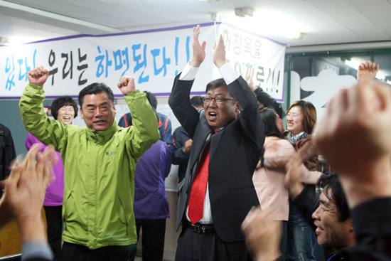 허창옥 도의원 당선자는 11일 자신의 선거사무소에서 당선이 확정되자 지지자들과 함께 함성을 지르며 기쁨을 감추지 못했다.
