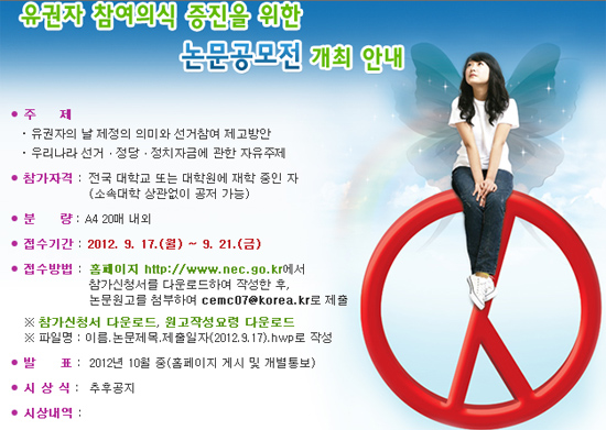 중앙선거관리위원회에서 전국 대학(원)생 대상으로 논문공모전을 개최한다.