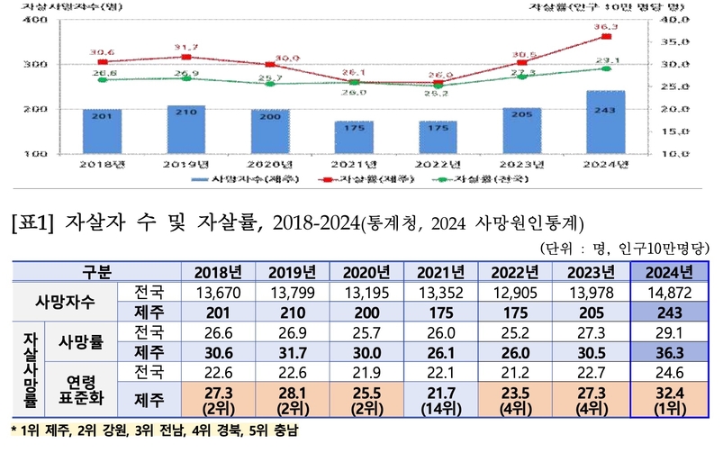 제주 지역의 자살 사망률이 통계 작성 이후 최고 수준으로 나타났다. 지난해 제주도의 인구 10만명당 자살 사망률은 36.3명이다. 전국 평균 29.1명을 웃돌며 17개 시·도 가운데 1위를 기록했다. 연령표준화 자살 사망률도 32.4명으로 전국 평균(24.6명)보다 1.3배 높았다.