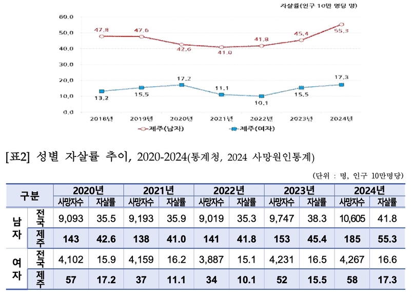 6일 통계청 ‘2024 사망원인통계’에 따르면, 지난해 제주도 자살 사망률은 남성이 185명, 여성이 58명으로 모두 243명이다. 전년 대비 38명(18.5%) 증가했다. 2021년 26.1명이던 자살 사망률은 2024년 36.3명으로 4년 연속 상승했다.