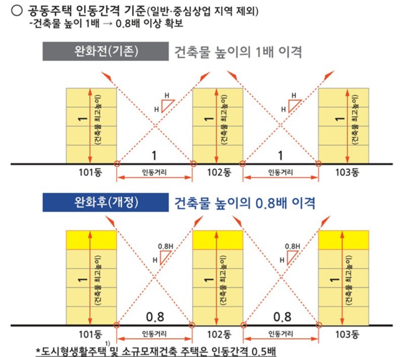 공동주택 규제도 완화된다. 채광창이 있는 벽면 높이와 인접 대지 간 이격거리(간격)는 기존 높이의 2배에서 최대 3배까지 허용된다. 부지 내 인동간격(건축물 사이에 둬야 하는 최소한의 간격)은 기존 높이 1배에서 0.8배로 줄었다. 도시형 생활주택과 소규모 재건축사업은 0.5배까지 완화된다.