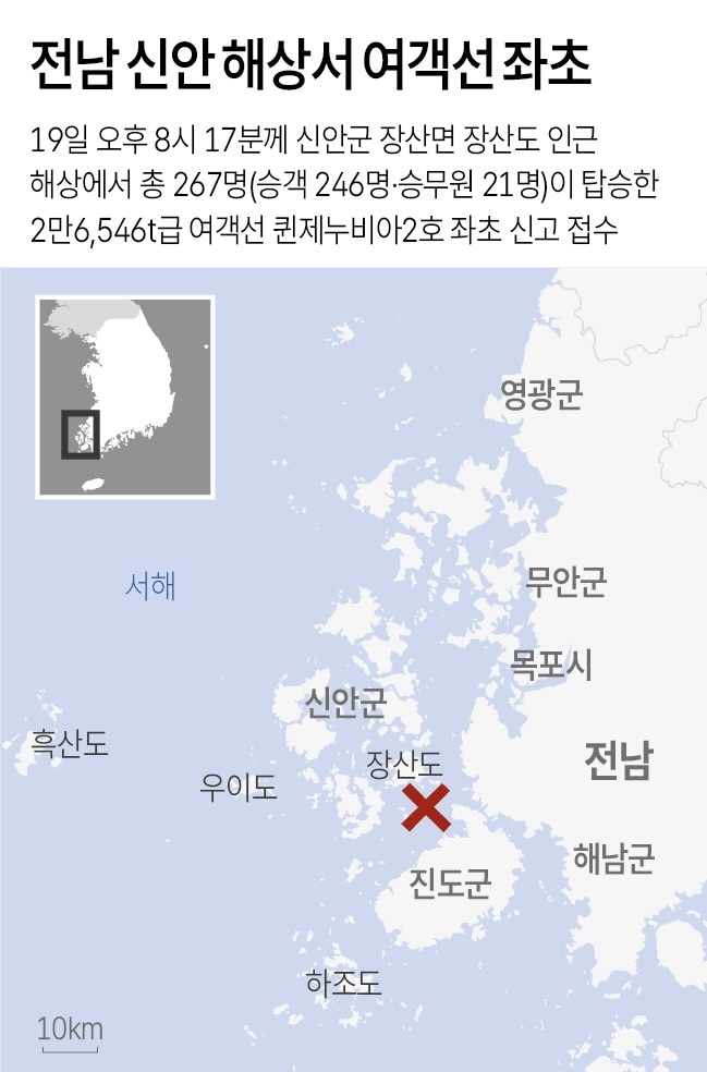 퀸제누비아2호는 승객 246명과 승무원 21명 등 모두 267명을 태우고 당일 오후 4시 45분께 제주에서 출발해 오후 9시께 목포항에 도착할 예정이었다.