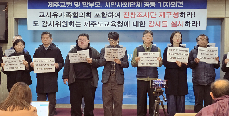 이들 단체는 25일 오후 제주도의회 도민카페에서 기자회견을 하고 독립적이고 공정한 진상규명을 위해 유가족이 지정하는 교사유가족협의회를 포함한 진상조사단 재구성을 촉구했다.