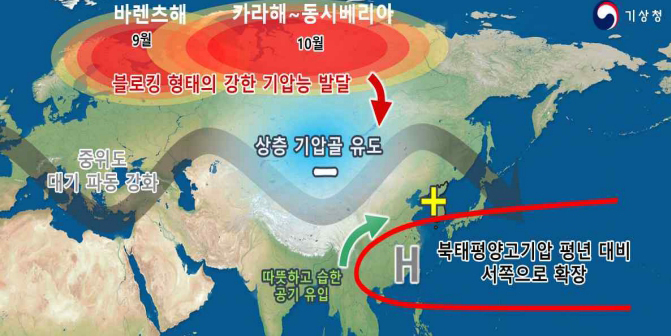 9월에 고기압 가장자리와 우리나라 남쪽을 지나는 저기압 영향을 계속 받으면서 비가 자주 내렸고, 천둥·번개를 동반한 매우 강한 비가 좁은 지역에 단시간에 내리는 경향을 자주 보였다.