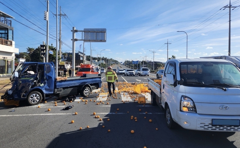 사고 당시 각 차량에는 운전자만 탑승해 있었다. 또 트럭에 실려 있던 감귤이 도로 위로 쏟아지면서 한때 사고 구간 일대에 교통 혼잡이 빚어지기도 했다. [제이누리=이기택 기자]