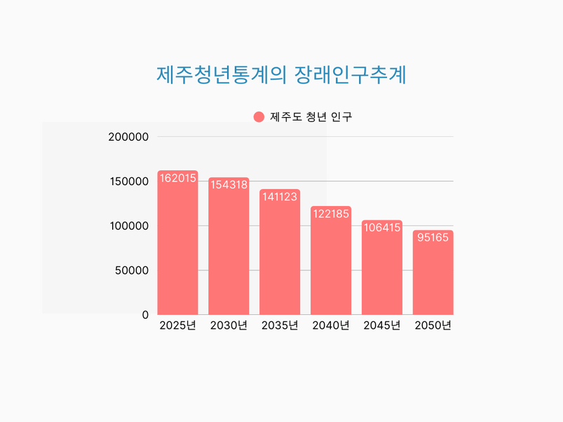 제주도 전체 인구 중 청년 인구 비율도 2025년 23.7%, 2030년 22.7%, 2035년 20.8%, 2040년 18.1%, 2045년 16%, 2050년 14.6%로 25년 뒤 9.1%p 감소가 전망된다.