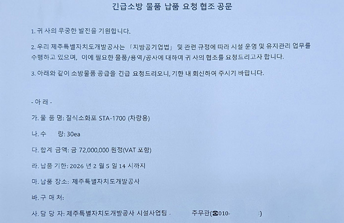 제주개발공사, '사기주의보' ... 긴급 소방물품 납품 허위 공문