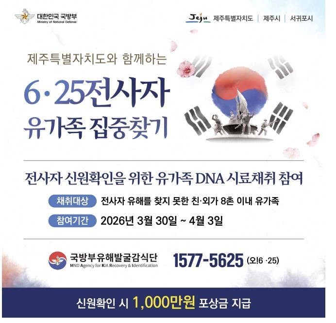 국방부 유해발굴감식단은 30일부터 내달 3일까지 닷새간 제주도 전역에서 6·25 전사자 유가족 찾기 활동을 전개한다고 이날 밝혔다.