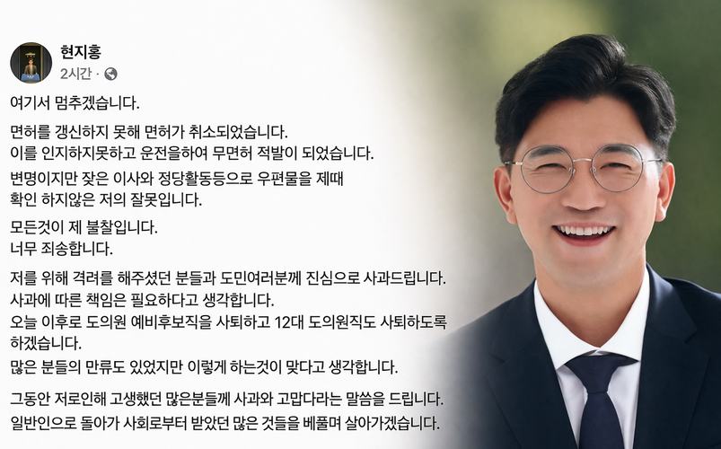 현 의원은 2일 자신의 SNS를 통해 “면허 갱신을 하지 못해 취소된 사실을 인지하지 못한 상태에서 운전하게 됐다”며 “모든 책임은 전적으로 저에게 있다”고 밝혔다.