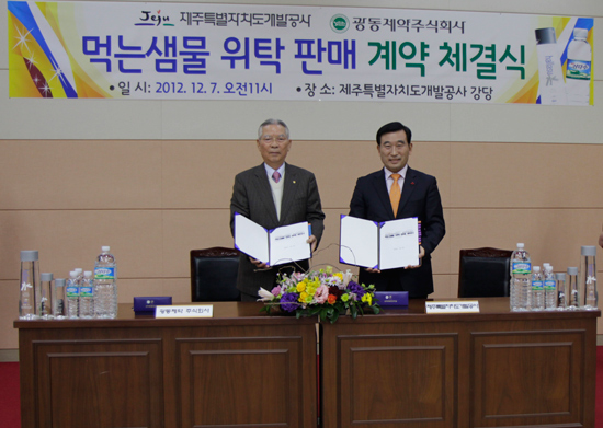 이와 관련해 제주도개발공사는 지난 7일 공사 강당에서 제주도개발공사(사장 오재윤)와 광동제약주식회사(회장 최수부)간 ‘제주삼다수’ 위탁판매 계약을 체결했다고 밝혔다.
