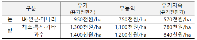 * 무농약 인증 농가 중 ‘유기전환기’에 있는 경우 ‘유기 또는 유기지속’ 단가 적용