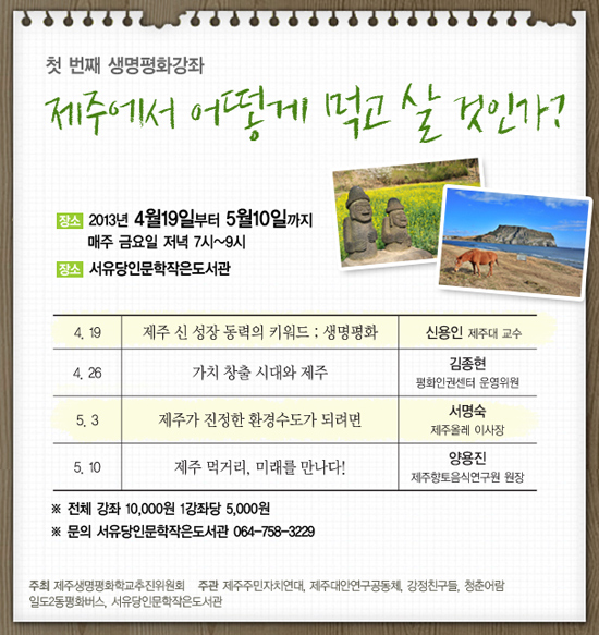 ‘제주에서 어떻게 먹고 살 것인가’를 주제로 제주의 미래 비전에 대한 담론을 공유하는 생명평화강좌가 열린다.