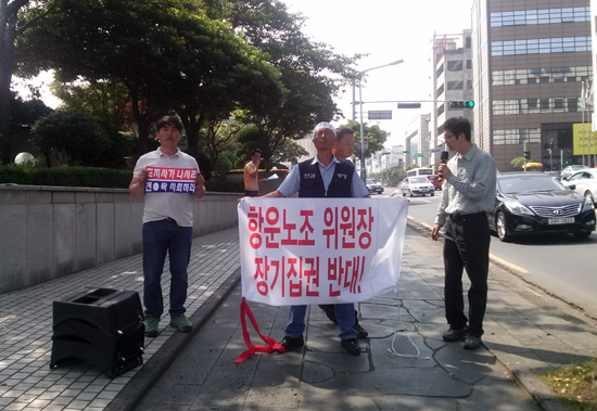이날 4선 연임이 확정된 전경탁 제주항운노조 위원장에 대해서는 “이전 위원장인 고승화씨가 21년간 권력을 휘두르다 후배인 전경탁씨에게 물려줬다. 그 대가로 현재까지 10여년 동안 땀 한 방울 흘리지 않고 매달 500여만원씩 고문이란 이름으로 임금을 받고 있다”면서 '권력 독점'이라고 비판했다.
