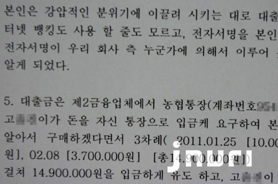 H씨는 “제2금융업체에서 내 통장으로 대출금이 들어왔고, 곧바로 업체 관계자로 입금하도록 강요 받았다”고 말했다. 그는 모두 3차례(S대출회사 1000만원 연 금리 23%, J은행 200만원 연 금리 42%, R대출회사 300만원 연 금리 38.8%)에 걸쳐 1500만원을 대출받았다.