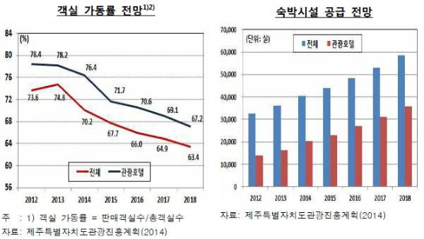 제주도는 2015년 이후 관광객 증가율이 점차 둔화되면서 객실 가동률이 지속적으로 하락, 2018년에는 63%까지 떨어질 것으로 예상하고 있다.