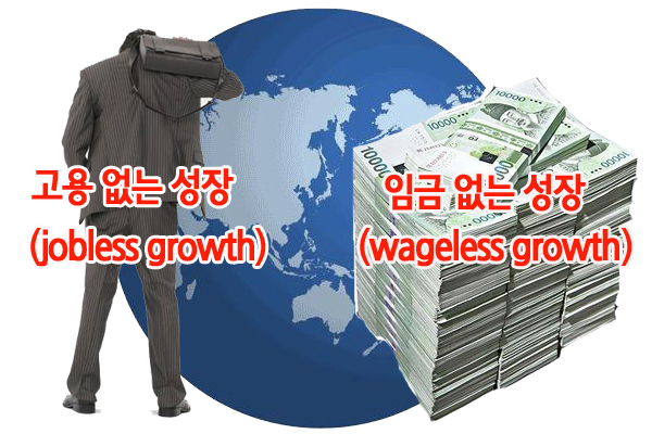 그나마 일자리가 생겨도 저임금노동자들이 양산되면서는 경제성장 과실이 국민생활의 향상에 크게 작용하지 않는 이른바 ‘임금 없는 성장(wageless growth)’ 또한 구조화되는 양상이 현저하다. 설상가상으로 성장의 혜택이 소수 고소득 계층에 집중되면서는 소득 불평등이 갈수록 악화되고 있다. 국가경제의 중심 측이라고 할 수 있는 중산층이 몰락하고 있다.