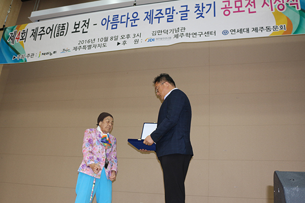 이 자리를 빌어서 그토록 아름다운 자리를 만들어 준 <제이누리>에게 가슴 뜨거운 감사를 드린다. 그리고 함께 협력해 준 제주특별자치도, 제주발전연구원, 연세대학교 제주동문회 등에게도 진심으로 고마운 인사를 올린다. 이 글을 쓰면서 거듭 느끼기는, 제주어를 살리고 전하고 보전하는 일은 제주의 자연을 가꾸고 지키고 지속시키는 일 만큼 소중하다. 제주인이 아니고선 어머니 같은 제주의 자연을 진심으로 지켜낼 수 없을 테니까. 제주어가 없이는 제주인의 정신을 이어갈 수 없지 않은가. / 수상자를 대신해 딸 허정옥이 씀