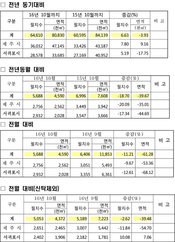 제주도가 10월까지 토지거래현황을 분석한 결과 지난해 같은 기간과 비교해 필지 수는 6.63% 증가한 반면 거래 면적은 3.93% 감소한 것으로 나타났다고 15일 밝혔다.