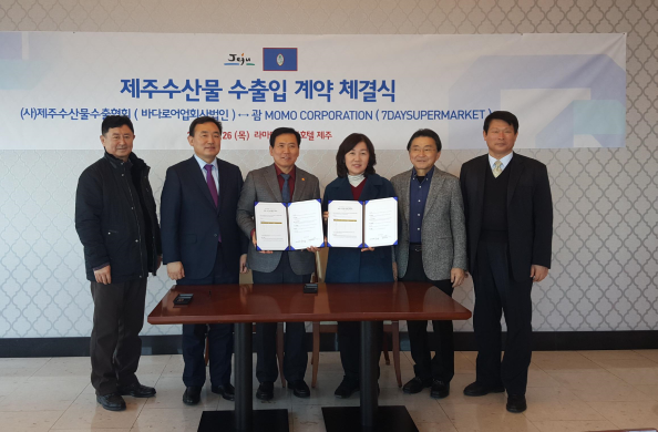 (사)제주수산물수출협회는 지난 26일 라마다프라자 제주호텔에서 미국 괌 세븐데이마켓과 청정제주수산물 100만불 수출입 계약을 체결했다.