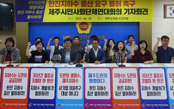 제주시민사회단체연대회의는 28일 제주도의회 도민의방에서 기자회견을 갖고 "제주도는 한진그룹의 무리한 지하수 증산 요구에 휘둘리지 말아야 한다"며 이같이 밝혔다.