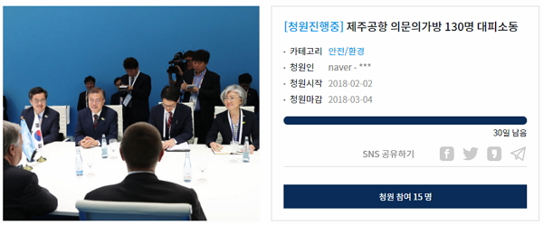 ![청와대국민청원 홈페이지'제주공항 의문의가방 130명 대피소동’이란 제목의 청원이 올라왔다. 이번 소동의 원인을 제공한 여행객들에게 보상을 하지 말라는 내용이다. [청와대국민청원 홈페이지 캡쳐]](/data/photos/201802/35114_47136_532.jpg)