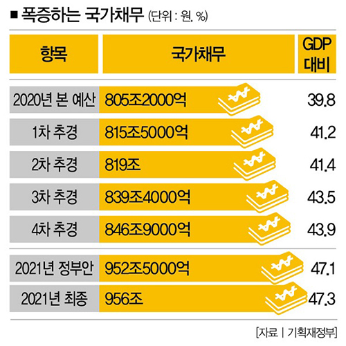 정부와 여당은 그동안 소득주도 성장과 최저임금 인상, 비정규직 제로(0)화, 부동산 대책 등 정책 실패를 땜질하기 위해 확장재정 정책을 펴왔다. 코로나19 사태 이후에는 추가경정예산을 네차례나 편성했다. 국내 경제ㆍ사회 상황 및 대외여건 변화에 기민하게 대응하는 맞춤정책보다 재정 살포에 의존하는 재정중독이 심했다.