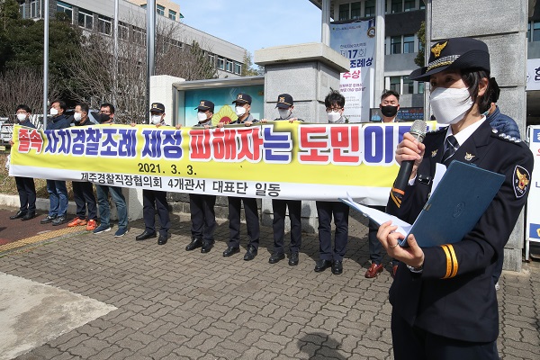 제주경찰청 직장협의회는 3일 오전 제주도의회 앞에서 기자회견을 갖고 제주도에 '제주도 자치경찰사무 및 자치경찰위원회 운영 등에 관한 조례안'을 즉각 수정할 것을 촉구했다.