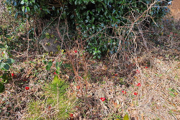 나즈막한 언덕 양지 바른 숲 사이로 동백나무의 빨간 꽃 한송이가 눈에 들어왔다. 가시덤불을 뚫고 솟아오르려 몸부림치는 이 동백은 잠시 화려하게 피었던 한송이가 시들어가며 곧 떨어질 듯이 위태롭고 다른 꽃송이들이 곧 피어날 준비를 하는 중이다. 도시에서 많이 보던 개량종이 아니라 이 숲속에서 나고 자란 야생동백이다.