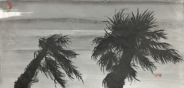 그림에서 종려나무의 먹빛과 먹색의 단순한 실루엣은 외부의 중·담묵 그리고 붓질속에서 나오는 우연한 비백의 배경과 극명한 대비를 이룬다. 사물과 배경이 둘이면서 하나인 빛과 어둠을 동시에 보여준다.