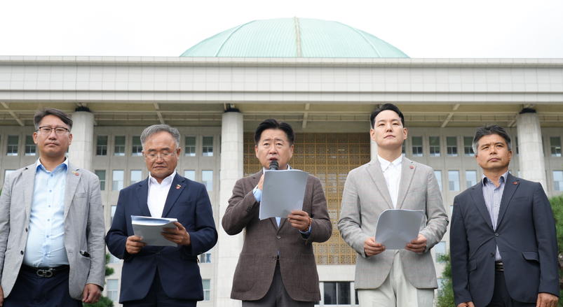 오영훈 제주지사와 김한규 더불어민주당 제주도당 위원장, 김창범 제주4·3희생자유족회 회장은 지난 12일 오후 국회 앞에서 기자회견을 열고 "제주도민과 4·3의 역사를 짓밟고 극우정치의 본색을 드러낸 국민의힘을 규탄한다"며 공식 사과를 촉구했다.