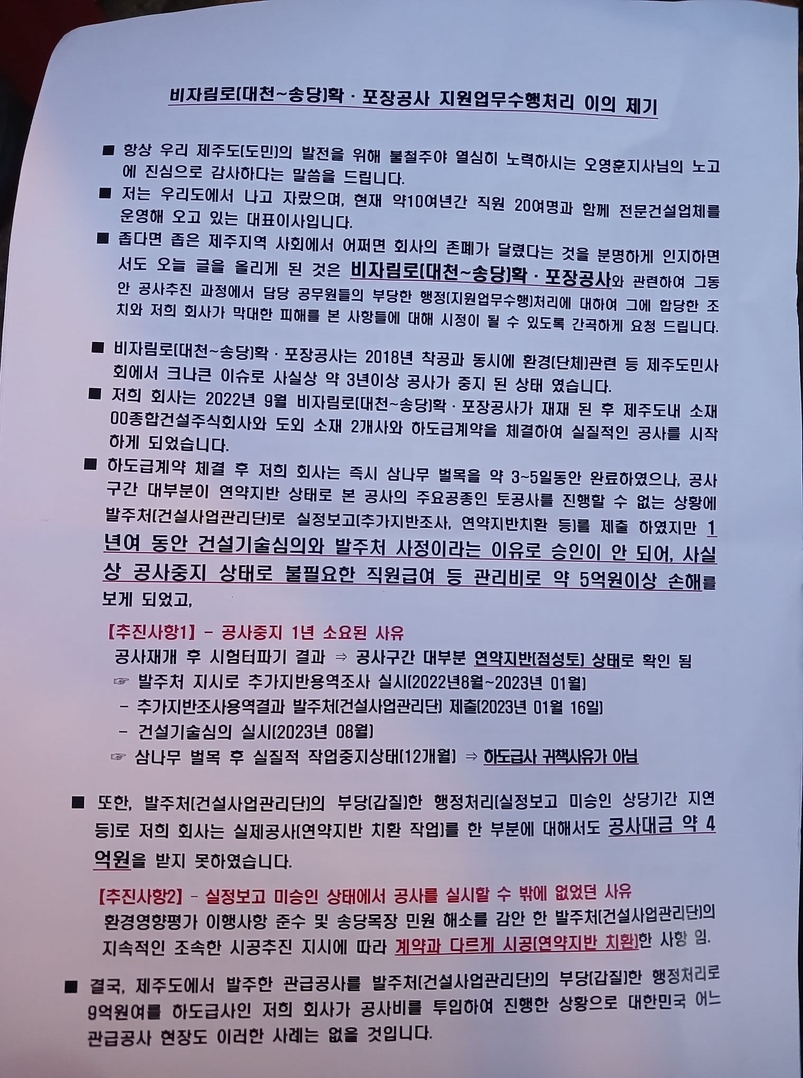13일 도내 건설업계와 제주도청 홈페이지 민원 게시판에 따르면 비자림로(대천~송당) 확장·포장공사를 맡은 한 전문건설업체는 "공사를 완료하고도 약 5억원의 관리비 손실과 4억원 규모의 공사대금을 지급받지 못했다"며 "행정기관의 부당한 업무처리로 회사가 심각한 피해를 입었다"고 주장했다.