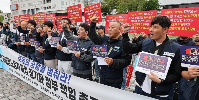 김선종 공공운수노조 부위원장은 "지난해에만 공항 노동자 5명이 목숨을 잃었다. 이는 개인의 과실이 아니라 구조적 문제이며 차별과 외주화가 만든 결과"라며 "정부가 약속한 정규직 전환과 안전한 노동환경 보장을 더 이상 미뤄서는 안 된다"고 강조했다.