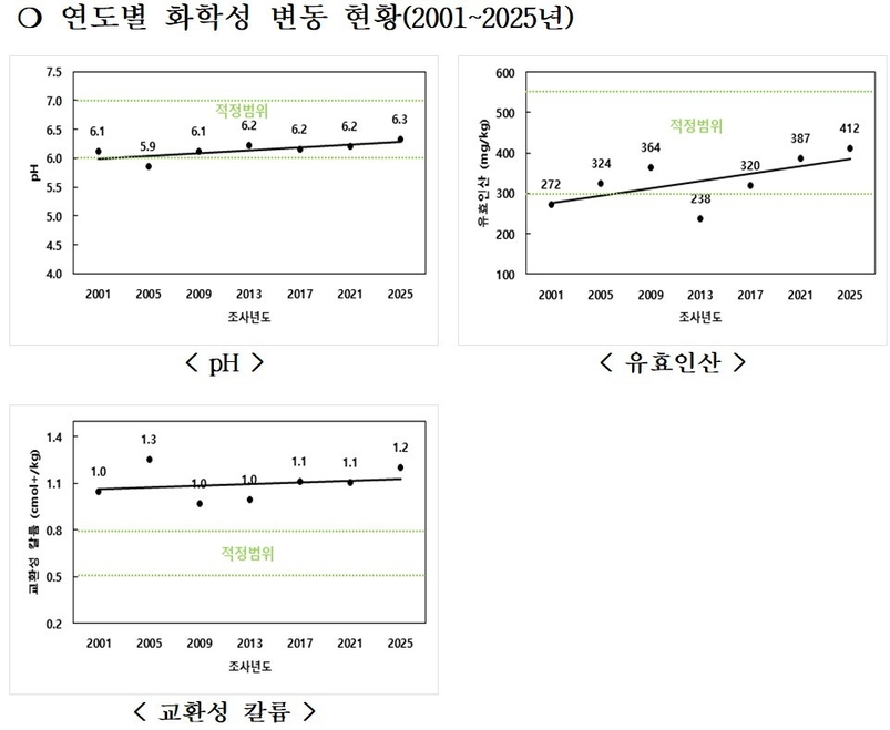 작물 뿌리 발달과 꽃·열매 형성에 필수적인 유효인산 함량은 2001년 272㎎/㎏에서 2025년 412㎎/㎏으로 크게 증가했다. 이는 적정 범위(300∼550㎎/㎏) 내에 있어 긍정적인 변화로 평가된다.