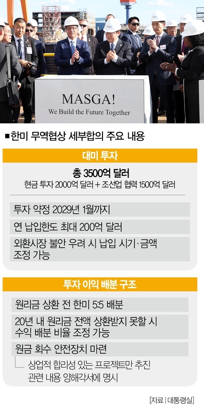 다만, 현금 투자를 미국이 요구한 선불이 아닌 ‘연 200억 달러 상한·10년 분할’ 납부로 분산했다. 투자는 ‘상업적 합리성이 있는’ 프로젝트에만 추진하고, 수익은 원리금 상환 이전에는 양국이 5 대 5로 나누기로 했다.