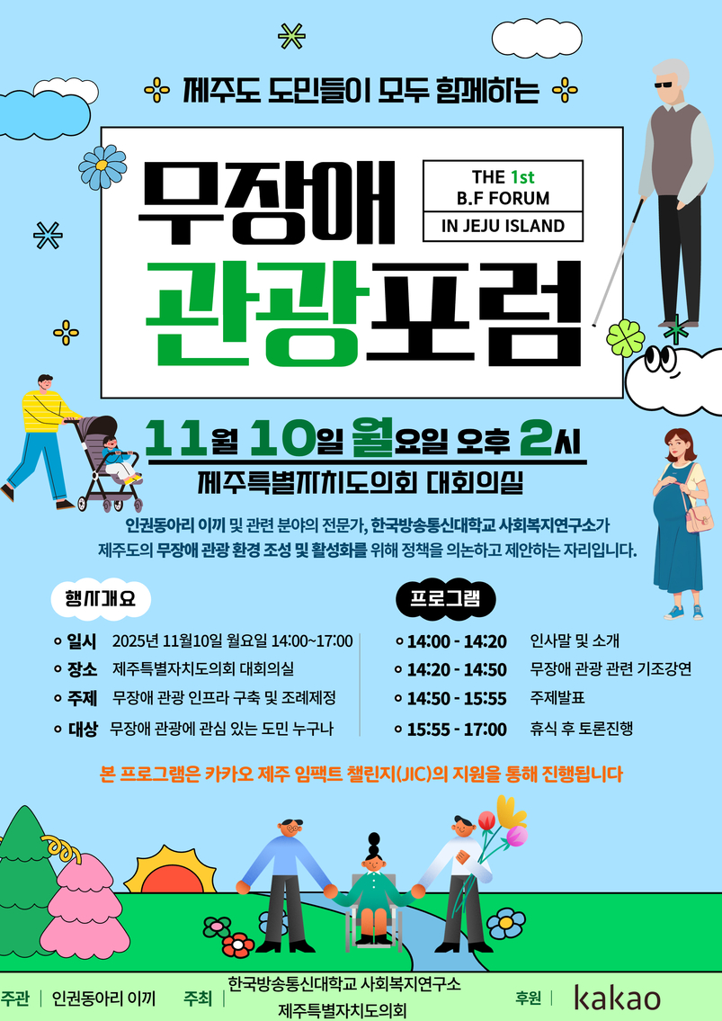 제주도의회와 한국방송통신대 사회복지연구소가 주최하고 인권동아리 '이끼'가 주관하는 이 포럼은 무장애 관광 환경 조성과 지원을 위한 조례 제정에 앞서 제도적 기반을 논의하고 도민 공감대를 이끌기 위해 마련됐다.