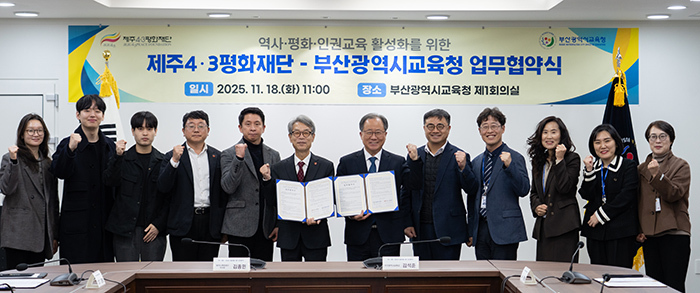 제주4·3평화재단과 부산시교육청이 지난 18일 부산시교육청에서 올바른 역사관 함양과 교사 및 학생 대상 역사·평화·인권교육 활성화를 위한 업무협약을 체결했다.