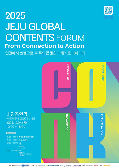 제주콘텐츠진흥원(이하 콘진원)은 오는 4일 진흥원 비인(Be IN;) 공연장에서 ‘2025 제주 글로벌 콘텐츠 포럼(Jeju Global Contents Forum)’을 연다.