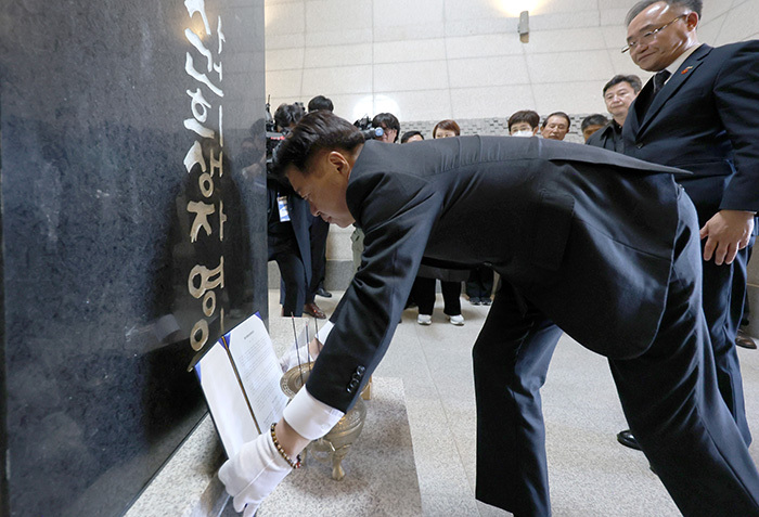 오 지사는 선포식 후 4·3평화공원 위령제단에서 헌화·분향한 뒤 위패봉안실을 찾아 평화인권헌장 선포 사실을 4·3영령에게 보고하고 헌장을 바쳤다.