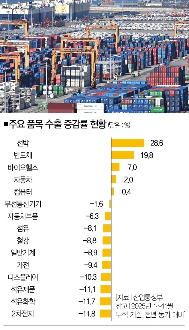하지만 속내를 보면 걱정스러운 부분이 적지 않다. 가장 큰 문제는 반도체 의존도가 너무 크다는 점이다. 반도체를 제외한 1~11월 누적 수출액은 4876억 달러로 지난해 같은 기간(4948억 달러)보다 1.5% 감소했다.
