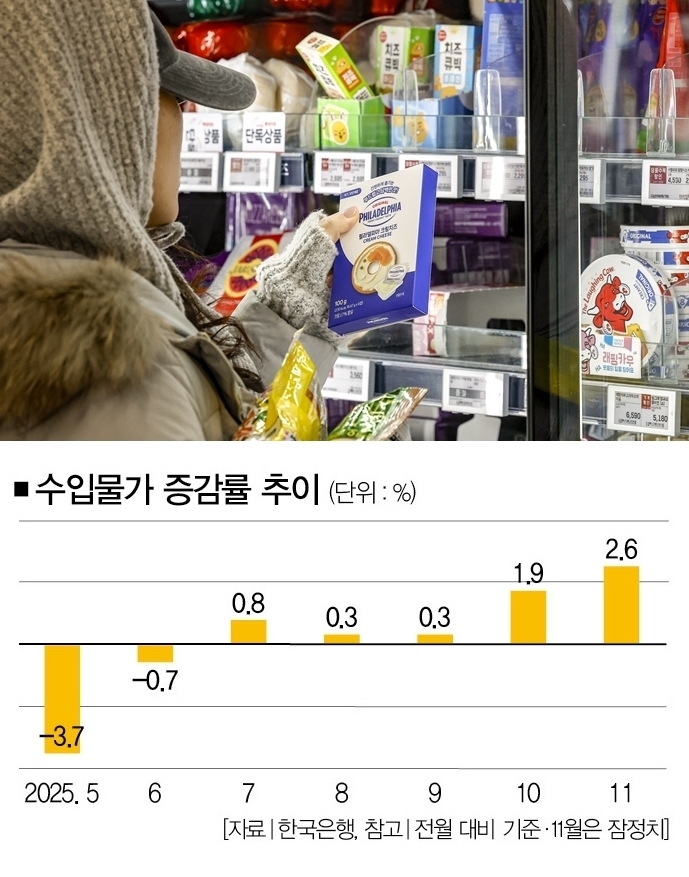 11월 수입물가는 지난해 11월 대비 2.6% 올랐다. 지난해 4월(3.8%) 이후 1년 7개월 만의 최고치다. 수입물가는 5개월째 상승했다. 이미 11월 소비자물가는 2.4%, 특히 생활물가는 2.9% 뛰었다. 환율 변수에 민감한 석유류와 농축수산물이 물가 상승을 주도했다.