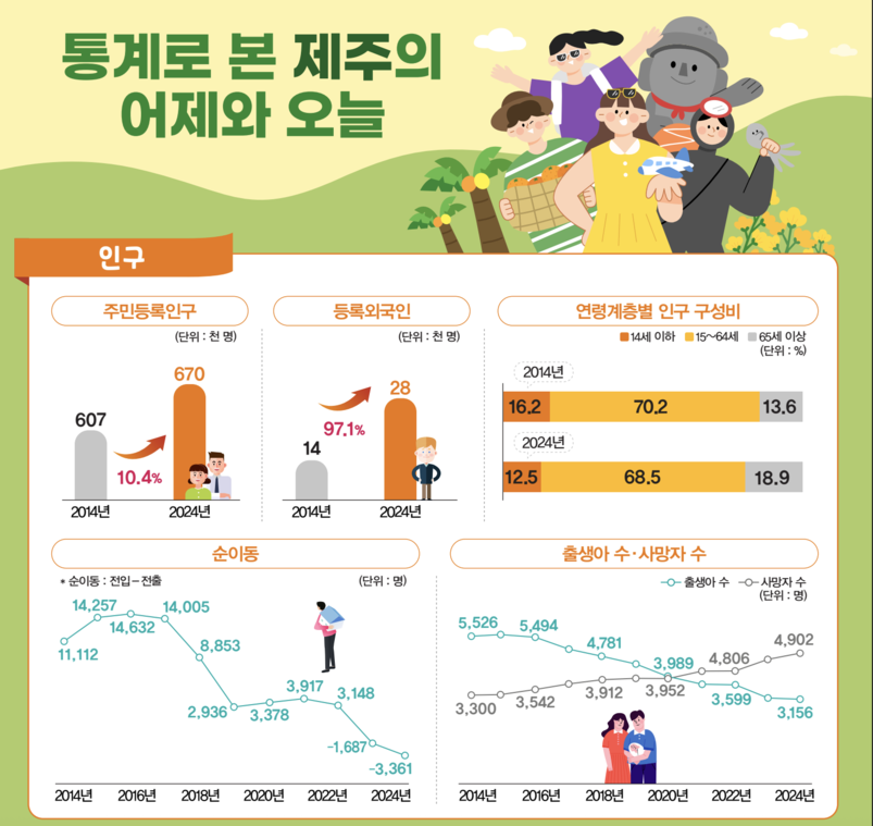 2014년부터 10년간 제주 인구는 7만6808명(12.4%) 증가했지만 65세 이상 고령인구 비중은 18.9%로 5.4%포인트 높아지며 저출산·고령화가 빠르게 진행되고 있다. 등록외국인은 2만7990명으로 2014년 대비 1만3786명(97.1%) 급증해 인구 증가에 일부 견인했다.