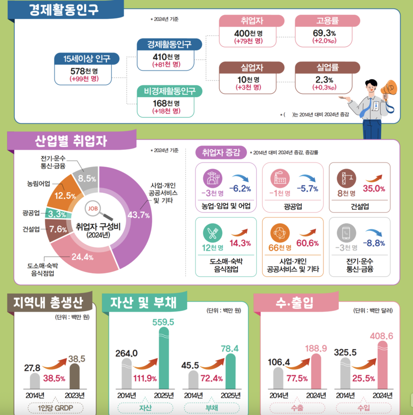 고용 여건은 개선된 것으로 나타났다. 2024년 경제활동인구는 41만명으로 2014년 대비 8만1000명 증가했고, 취업자는 40만명으로 7만9000명 늘었다. 고용률은 69.3%로 2.0%p 상승했다. 실업자는 1만명으로 3000명 증가했으며, 실업률은 2.3%로 0.3%p 올랐다.