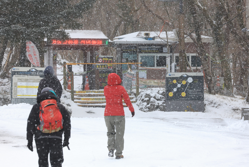 기상청은 대설특보가 발효된 산지와 중산간에는 시간당 1∼3㎝의 눈이 내리는 곳이 있겠으니 안전사고와 시설물 관리 등에 유의해야 한다고 당부했다. [제이누리=이기택 기자·연합뉴스]