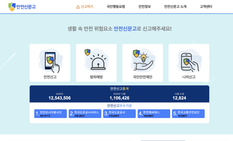 안전신문고는 행정안전부가 운영하는 범정부 안전신고 통합 시스템으로 일상생활 속 안전 위험요소를 신고하면 관계 기관이 이를 접수해 처리하는 시스템이다.